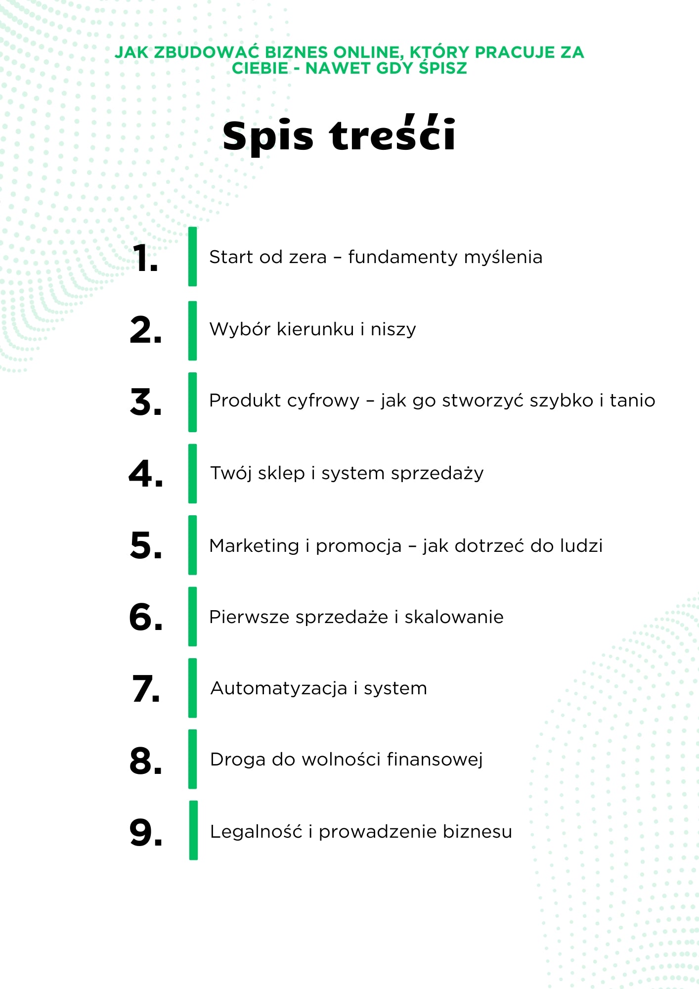 ✅ 9 rozdziałów praktycznej wiedzy - od wyboru niszy po automatyzację biznesu